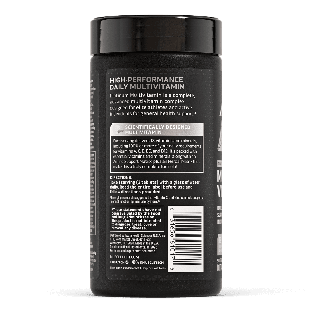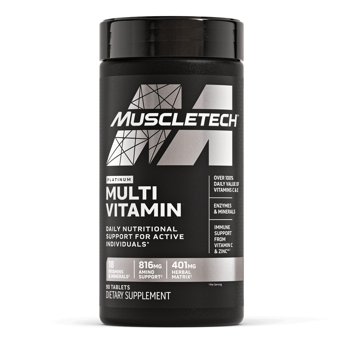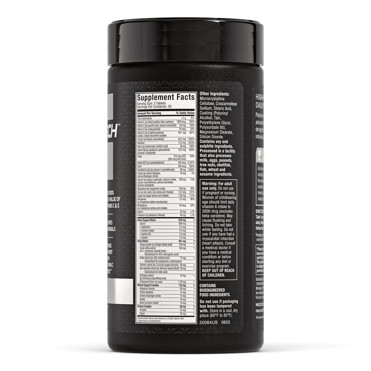 Fuel your active lifestyle with Platinum Multivitamin — a complete, science-inspired formula that provides essential vitamins, minerals, and key support complexes. Each serving delivers 18 vitamins and minerals, including 100% or more of your daily requirements for vitamins A, C, E, B6, and B12. It’s also formulated with an Amino Support Matrix, Herbal Matrix, and Enzyme Complex, making it a truly comprehensive multivitamin for everyday performance and wellness.